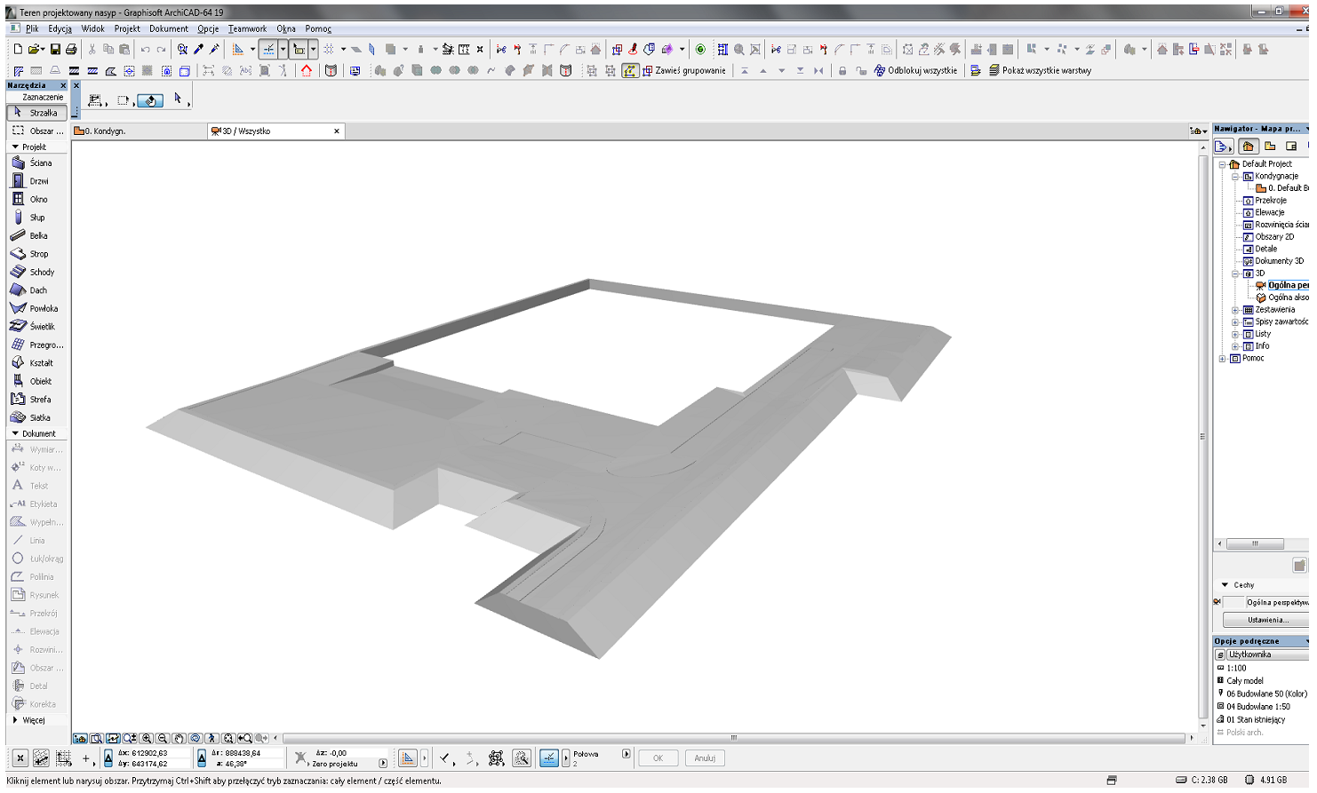 Program Archicad udostępnia szereg bardzo przydatnych narzędzi, które można zastosować dla potrzeb tworzenia brył robót ziemnych w celu uzyskania objętości nasypów oraz wykopów. Bryły robót ziemnych powstają poprzez odpowiednią obróbkę dwóch innych brył terenu projektowanego oraz terenu istniejącego, przy czym modyfikacja jest przeprowadzana osobno dla bryły nasypowej oraz bryły wykopowej.