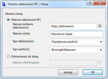 W tym przykładzie zmapujemy wysokość słupa dla utworzonej właściwości. Na początku zaznaczamy pozycję IfcColumn w liście hierarchicznej, następnie klikamy przycisk Utwórz…. W oknie, które się wyświetliło, zaznaczamy opcję Własna właściwość IFC, dodajemy nazwę zestawu właściwości (Słup_właściwości) i nazwę cechy (Wysokość słupa). W kolejnym kroku określamy typ właściwości (Pojedyncza wartość) oraz Typ wartości (IfcLengthMeasure) (Rys.11).