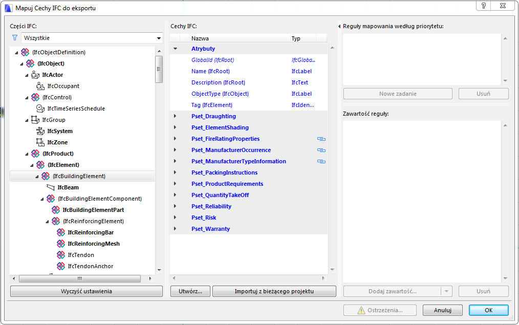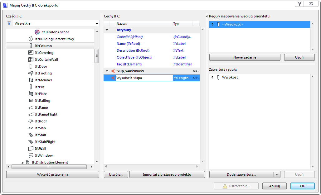 Opcja Importuj z bieżącego projektu służy do zaimportowania do translatora cech IFC dodanych w Menedżerze IFC lub w Ustawieniach elementów.