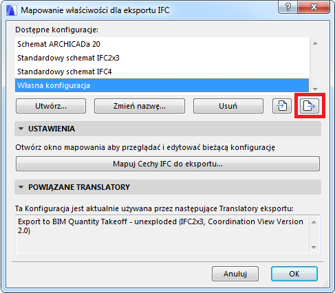 Aby wyeksportować konfigurację ustawień mapowania właściwości do pliku XML otwieramy okno Mapowanie właściwości dla eksportu IFC i klikamy w przycisk służący do eksportu (Rys. 16).