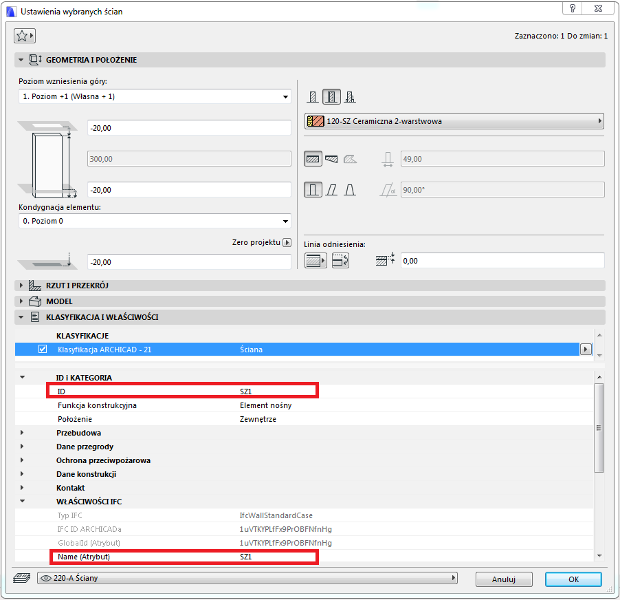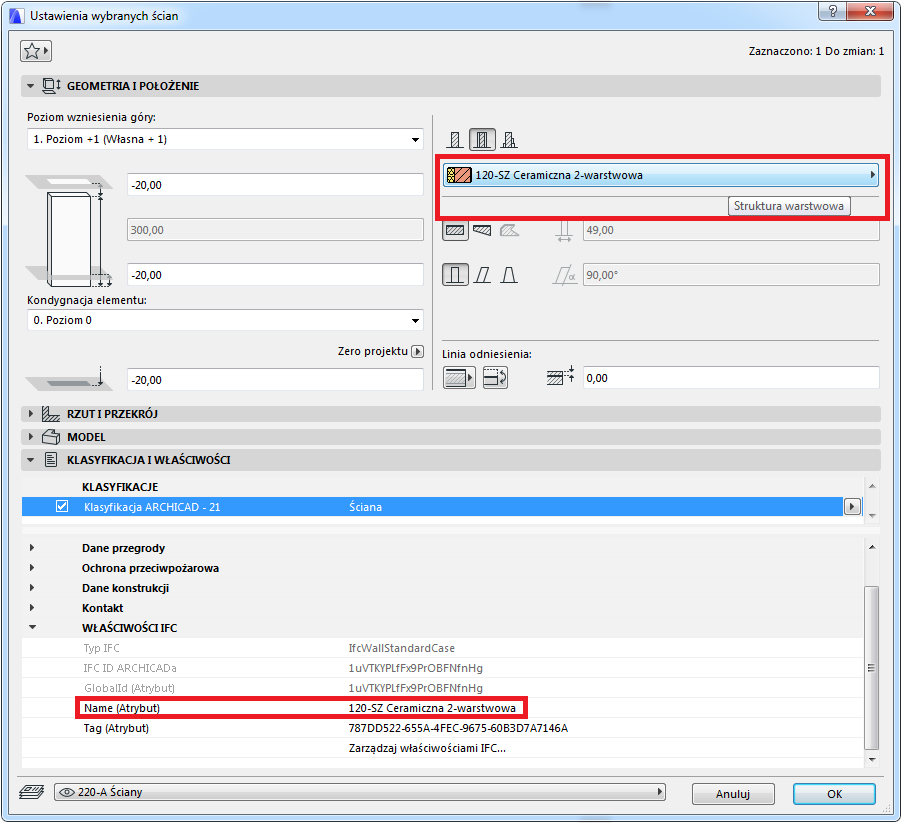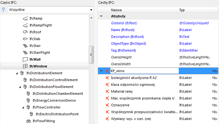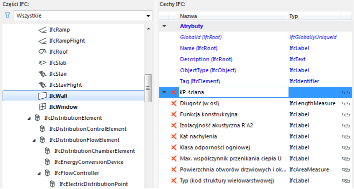 właściwości i parametry, np. ID elementu, Materiał budowlany/struktura warstwowa/profil/wypełnienie