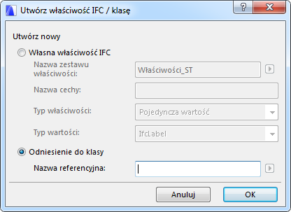 W przypadku opcji odniesienia do klasy (Rys. 7) określamy nazwę referencyjną, a następnie wybieramy z listy system klasyfikacji (lista kompatybilna jest z systemami klasyfikacji dostępnymi w Menedżerze klasyfikacji). Pamiętać należy, że aby utworzone przez nas odniesienia zostały wyeksportowane do IFC, musimy odpowiednio przypisać części IFC dla każdej z klasyfikacji.