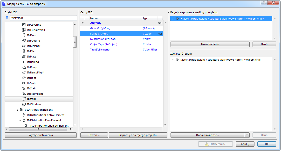 Najpierw wybieramy z listy hierarchicznej IfcWall, następnie zaznaczamy atrybut Name i dodajemy Nowe zadanie. Do utworzonego pola reguły przypisujemy zawartość (Dodaj zawartość… → Dodaj parametry i właściwości → Ogólne → Materiał budowlany / struktura warstwowa / profil / wypełnienie → Dodaj). Okno mapowania Cech IFC do eksportu po przygotowaniu reguły mapowania przedstawiono na Rys. 9. Przy atrybucie Name pojawiła się ikona łańcucha (oznaczająca, że właściwość została zmapowana).