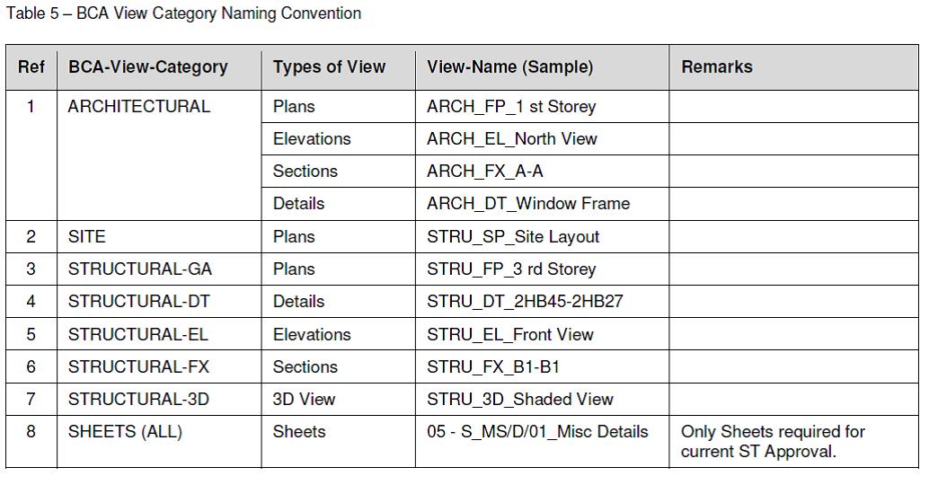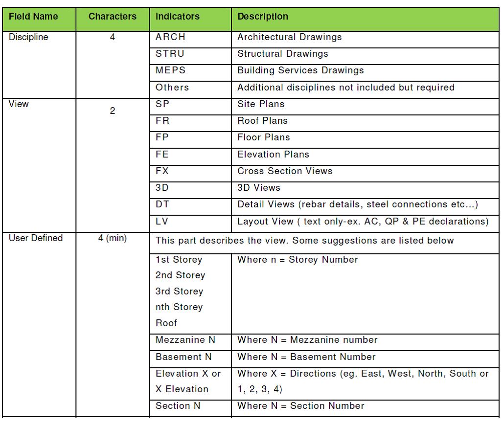 źródło: „BIM e – Submission Guideline Structural”[2], pkt. 1.8a, str.8, „Naming Convention for each Drawing View”