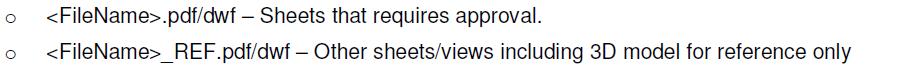 - formy przekazania dokumentacji (dwa oddzielne pliki DWF/PDF: 1. ogólne informacje, plany pięter, elewacje, przekroje, harmonogramy, informacje zebrane w arkuszach z tabelami – ten plik jest do zatwierdzenia; 2. rysunki architektoniczne (rzuty, elewacje, przekroje, etc.), model 3D w zakresie konstrukcji, plany montażowe, dodatkowe widoki – ten plik jest plikiem referencyjnym). Osobą odpowiedzialną za skompletowanie dokumentacji w oparciu o powyższe wytyczne jest tzw. QP (Qualified Person[3])
