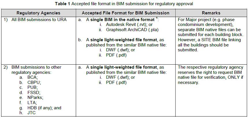 Bezpośrednio pod tabelką znajdziemy przypis '1′ tłumaczący, co autorzy niniejszego dokumentu rozumieją pod pojęciem „single BIM in the native format”, który w oryginale brzmi następująco: ” These are based on the IFC certified BIM applications that are commonly used by the local industry and are prepared for BIM submission to-date by going through a series of pilot runs with the authority. The accepted file format may be expanded when new BIM vendor(s) has met the requirements and ready for local BIM submission.”