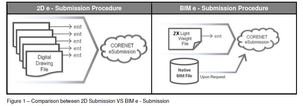 W latach 2007-2008 Building and Construction Authority (BCA) poczyniła duże wysiłki, aby docelowo zaimplementować elektroniczny system przekazywania dokumentacji (BIM e-submission system), co znacznie usprawniło cały proces. Od 2010 roku, dziewięć agencji regulacyjnych zaczęło przyjmować architektoniczne modele 3D BIM do zatwierdzenia, korzystając właśnie z opracowanego wcześniej systemu elektronicznego. W 2011 roku zostało to rozszerzone i wprowadzone również na okoliczność przekazywania projektów branżowych: konstrukcja, MEP (instalacje mechaniczne, elektryczne, sanitarne). Od roku 2013 rząd Singapuru wprowadził wymóg wykorzystywania elektronicznego systemu przekazywania dokumentacji w celu jej zatwierdzenia i uzyskania pozwoleń na projekty o powierzchni większej niż 20.000 m2. Docelowo w 2015 roku wymaganiem tym objęte zostaną wszystkie obiekty o pow. większej niż 5000 m2. [5]