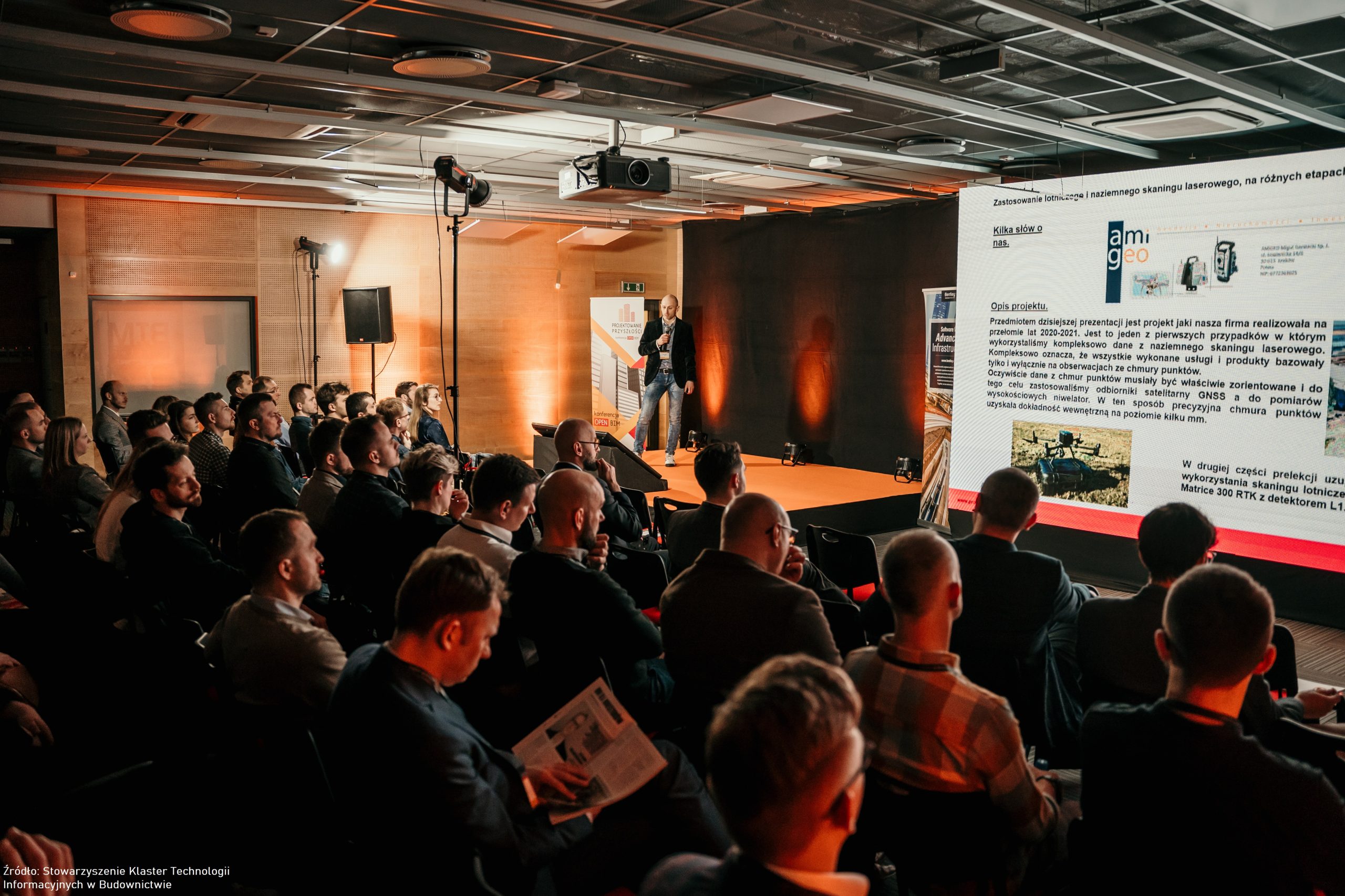 Konferencję otworzył Michał Garstecki – członek zarządu BIM Klastra oraz współwłaściciel firmy Amigeo. W ramach swojego wystąpienia przedstawił projekt realizowany dla firmy Air Liquide na obszarze Huty ArcelorMittal w Dąbrowie Górniczej, na obszarze której obowiązuje wysoki reżim BHP. Skanera jednak – w przeciwieństwie do ludzi – nie obowiązują tego typu zasady, co stanowiło znaczne ułatwienie podczas realizacji czynności pomiarowych. “Skaning laserowy” kojarzy się jednak przede wszystkim z oszczędnością czasu oraz wysoką dokładnością, która zmniejsza zakres niezbędnej interpretacji sytuacji w terenie i zwiększa jakość jej odwzorowania. Jak to ujął Michał: “pozwala przynieść teren do biura”. W takiej sytuacji konieczność uzupełnienia danych do dalszej pracy czy pojawiające się w trakcie pracy wątpliwości nie wymagają fatygowania się na miejsce bo wszystko jest już w komputerze. Michał zaznaczył jednak, że aby mieć ten komfort i pewność oczekiwaną od geodety w zakresie lokalizacji widocznych na chmurze obiektów niezbędne jest wyrównanie sytuacyjne i wysokościowe oraz zorientowanie wykonanej w terenie chmury. Gdy to zrobimy może ona stanowić podstawę m.in. do opracowania mapy do celów projektowych, numerycznego modelu terenu oraz modelu 3D. Jest też przydatna do realizacji zadań prawno-geodezyjnych, jak przebadanie granic działek. Czy było warto? Zarówno Michał, jak i inwestor stwierdzili zgodnie, że tak.
