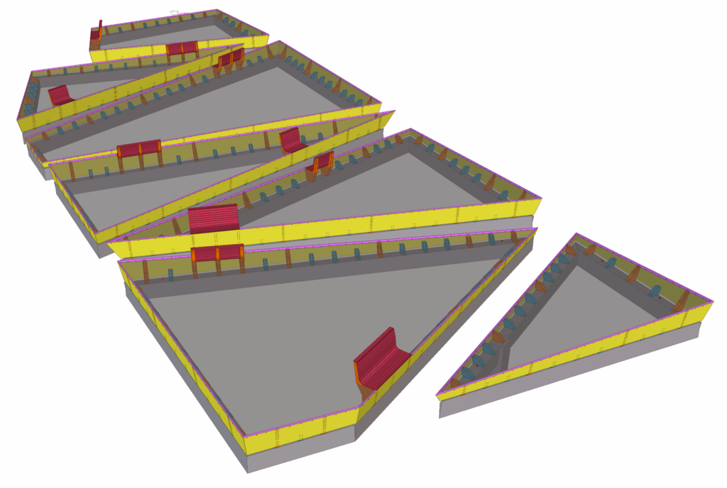 W związku z tym, że geometria tych gazonów jest bardzo skomplikowana (każdy z nich jest pochylony do ścieżki pod kątem 80 stopni i do tego ścieżki są pod różnymi spadkami związanymi z topografią terenu) postanowiliśmy skoordynować fundamenty na budowie tak aby idealnie pasowały do naszej stali, co pozwoli nam znacznie zaoszczędzić czas na ich montaż.
