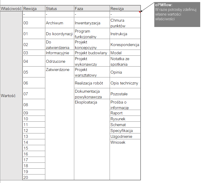 • wartości można skonfigurować pod własne potrzeby, np. rewizje możemy zamienić na literowe, statusy na zgodne z ISO 19650 itd.