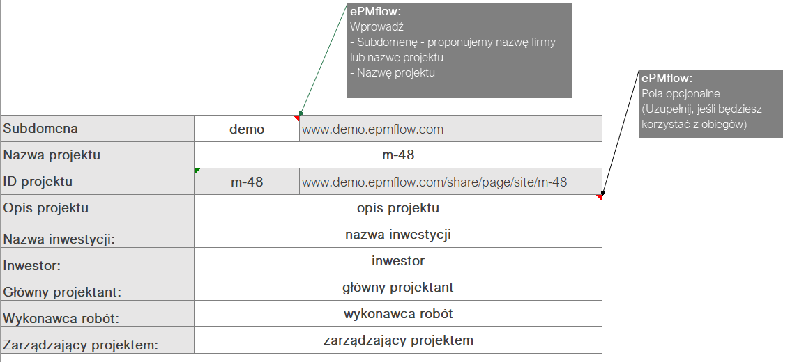 Na końcu jeszcze mała drobnostka, należy ustalić pod jakim adresem url będzie znajdowała się nasza przestrzeń, czyli określić subdomenę. Najczęściej jest to skrót nazwy firmy lub cała nazwa firmy. W przypadku kiedy klient planuje wykonać tylko jedną inwestycję, subdomena ma nazwę projektu. Przykłady: madengineers.epmflow.com / muzeumkrakow.epmflow.com