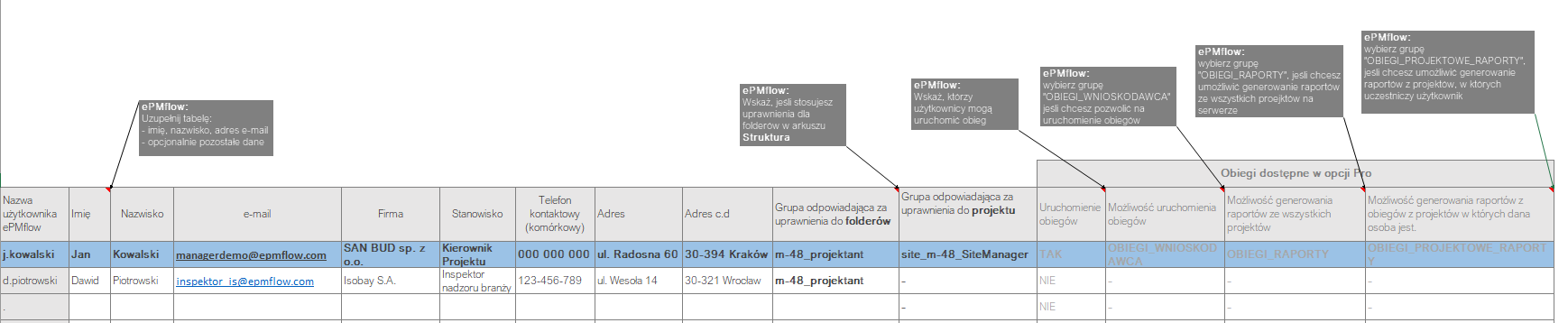 Na bazie ID Projektu z arkusza “Dane wstępne” zostaną automatycznie wypełnione pełne nazwy ID grup na ePMflow. Jest ich 16. Są to typowe grupy spotykane na większości inwestycjach budowlanych. Stworzą się automatycznie po utworzeniu projektu i są widoczne na platformie tylko dla osób które mają uprawnienia do tworzenia kont użytkowników. Jeśli mimo wszystko zdarzy się, że będzie potrzeba dodatkowych grup, wtedy należy dopisać je szablonie. Ważne, aby trzymać się zawsze standardu nazewnictwa: “ID projektu_rodzaj interesariusza”.