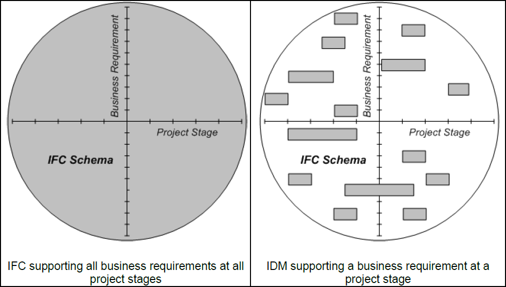 Co prawda nie dotyczą stricte zawartości modeli (LOD i LOI) ale równie dobrze obrazują te wymagania. Schemat IFC wspiera wszystkie (to jeszcze zależy od wersji ale ogólnie można tak powiedzieć) aspekty projektu w całym cyklu jego życia. My jednak skupiamy się tylko na tym, co bezpośrednio służy Naszemu Projektowi (i stawianym mu celom). IDM, czyli wytyczne początkowo skierowane dla producentów oprogramowania i mające wskazać im kierunek rozwoju oferowanych narzędzi (8) adaptujemy, zgodnie z zaleceniem zawartym chociażby w (9) na mniejszy rynek. Zakładamy swój własny zespół, który tworzy dostosowany do konkretnej sytuacji, możliwości i oczekiwań zestaw procedur związanych z realizacją tego jednego celu. Tak samo postępujemy z zawartością modeli – określamy jakie elementy są wymagane dla osiągnięcia konkretnych celów, na danym etapie, które można pominąć, ile informacji „upakować” w model, które z nich są nam potrzebne itd. Tylko wtedy, gdy określimy sobie te wymagania model będzie w stanie nam dobrze służyć i będzie nie przeszkodą, a pomocą w całym procesie projektowania a w kontekście długoterminowym również realizacji i zarządzania.