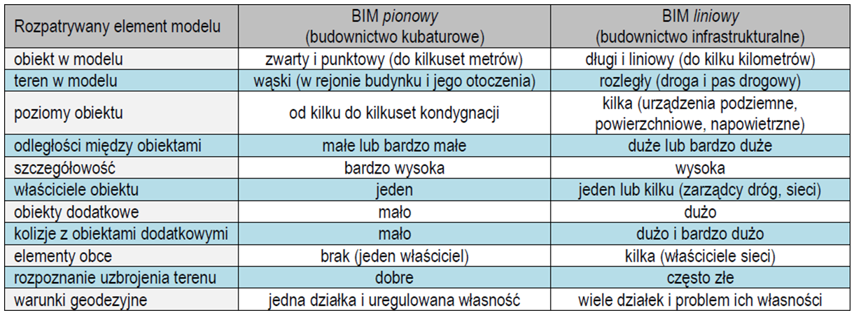 Tabela 1: Różnice w modelach BIM między obiektami kubaturowymi i infrastrukturalnymi (5)
